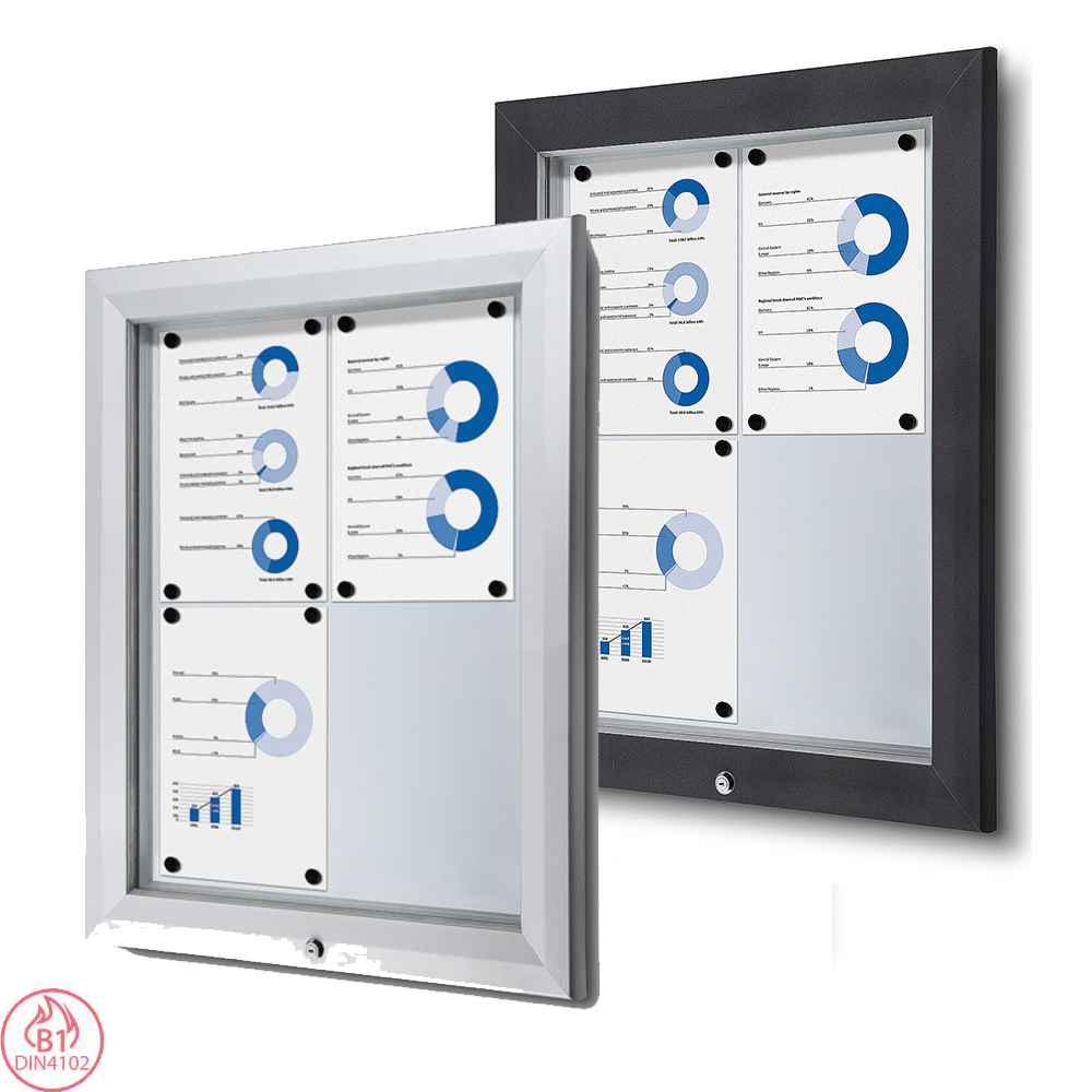 Präsentieren Sie Ihre Nachrichten oder Notizen sicher mit unserem abschließbaren Schaukasten mit beschreibbarer Metallrückwand. Der Schaukasten lässt sich unten öffnen und mit einem Schlüssel sicher verschließen, was einen einfachen Zugang und zusätzliche Sicherheit gewährleistet. Ab einer Größe von 12 x A4 sind Gasdruckfedern enthalten, die die Fronttür halten und für den Komfort des Benutzers sorgen. Notizen oder Nachrichten können mit Hilfe von Magneten leicht in der Vitrine angebracht werden. Der Schaukasten ist B1-zertifiziert, was ihn zu einem sicheren und idealen Schaukasten für die Nutzung im Freien sowie im Innenbereich macht.