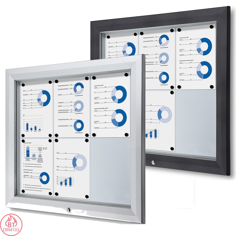 Präsentieren Sie Ihre Nachrichten oder Notizen sicher mit unserem abschließbaren Schaukasten mit beschreibbarer Metallrückwand. Der Schaukasten lässt sich unten öffnen und mit einem Schlüssel sicher verschließen, was einen einfachen Zugang und zusätzliche Sicherheit gewährleistet. Ab einer Größe von 12 x A4 sind Gasdruckfedern enthalten, die die Fronttür halten und für den Komfort des Benutzers sorgen. Notizen oder Nachrichten können mit Hilfe von Magneten leicht in der Vitrine angebracht werden. Der Schaukasten ist B1-zertifiziert, was ihn zu einem sicheren und idealen Schaukasten für die Nutzung im Freien sowie im Innenbereich macht.