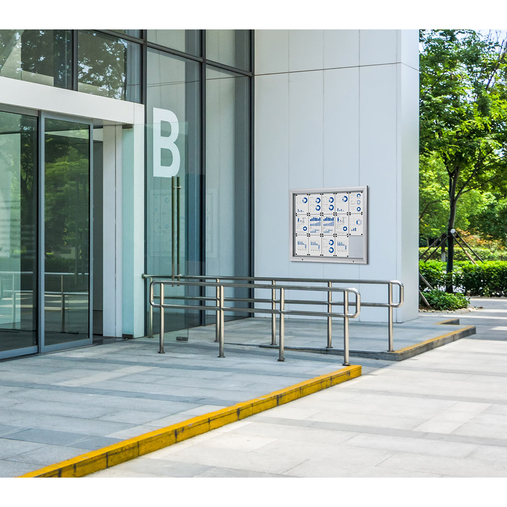 Dieser Schaukasten vereint Langlebigkeit und Funktionalität. Die Tiefe im Außenbereich beträgt 4,7cm und bezieht sich darauf wie weit der Schaukasten aus der Wand herausragt. Im Innenbereich beträgt die Tiefe 2,6cm, um den Inhalt in der Vitrine zu platzieren. Sie hat eine stabile Profilbreite von 2,6cm. Die 4mm starke ESG-Sicherheitsglastür sorgt für klare Sicht und erhöht die Sicherheit. Die Größen bis 12 x A4 sind mit einem Schloss ausgestattet, während die größeren Varianten ab 15 x A4 mit zwei Schlössern ausgestattet sind. Die eleganten auf Gehrung geschnittenen Ecken vervollständigen die Haltbarkeit und das polierte Design. Die Türen kleinerer Formate sind mit einer Haltestange ausgestattet, während größere Formate mit Gasdruckfedern für ein sanftes Öffnen sorgen.