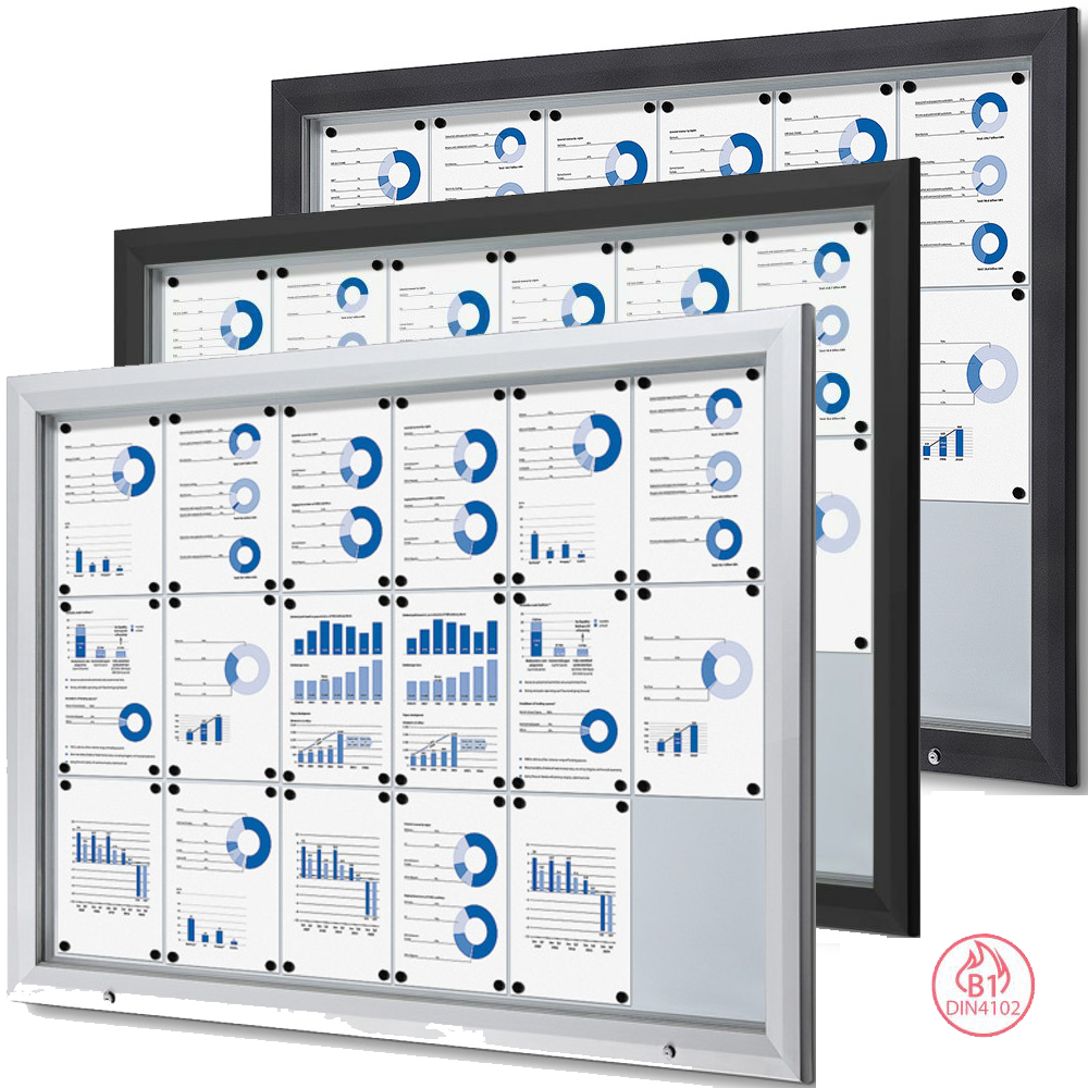 Präsentieren Sie Ihre Nachrichten oder Notizen sicher mit unserem abschließbaren Schaukasten mit beschreibbarer Metallrückwand. Der Schaukasten lässt sich unten öffnen und mit einem Schlüssel sicher verschließen, was einen einfachen Zugang und zusätzliche Sicherheit gewährleistet. Ab einer Größe von 12 x A4 sind Gasdruckfedern enthalten, die die Fronttür halten und für den Komfort des Benutzers sorgen. Notizen oder Nachrichten können mit Hilfe von Magneten leicht in der Vitrine angebracht werden. Der Schaukasten ist B1-zertifiziert, was ihn zu einem sicheren und idealen Schaukasten für die Nutzung im Freien sowie im Innenbereich macht.