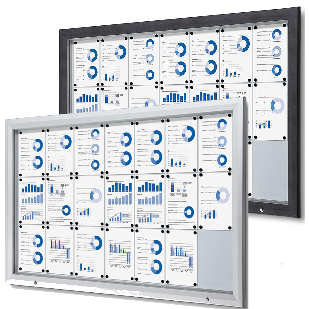 Präsentieren Sie Ihre Nachrichten oder Notizen sicher mit unserem abschließbaren Schaukasten mit beschreibbarer Metallrückwand. Der Schaukasten lässt sich unten öffnen und mit einem Schlüssel sicher verschließen, was einen einfachen Zugang und zusätzliche Sicherheit gewährleistet. Ab einer Größe von 12 x A4 sind Gasdruckfedern enthalten, die die Fronttür halten und für den Komfort des Benutzers sorgen. Notizen oder Nachrichten können mit Hilfe von Magneten leicht in der Vitrine angebracht werden. Der Schaukasten ist B1-zertifiziert, was ihn zu einem sicheren und idealen Schaukasten für die Nutzung im Freien sowie im Innenbereich macht.