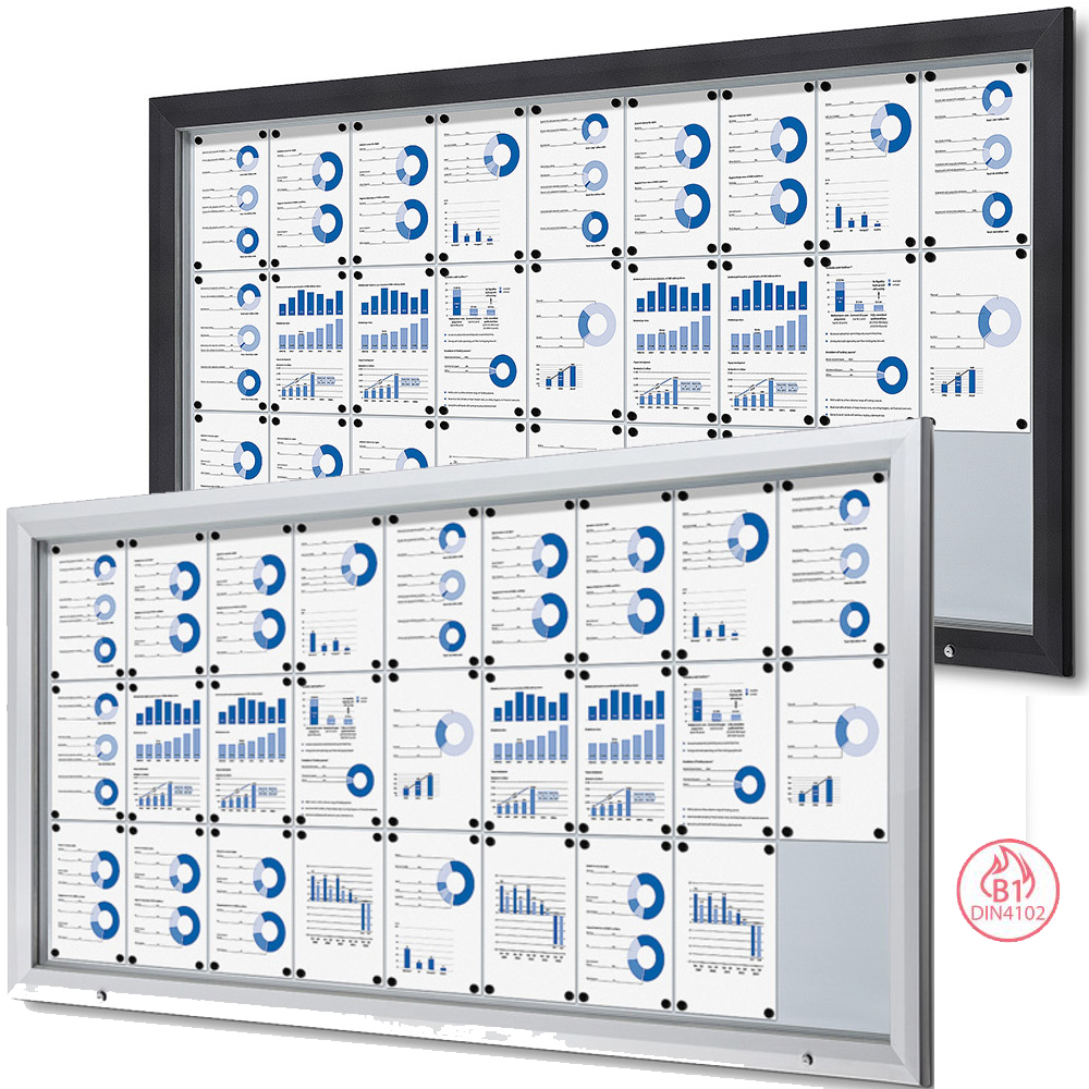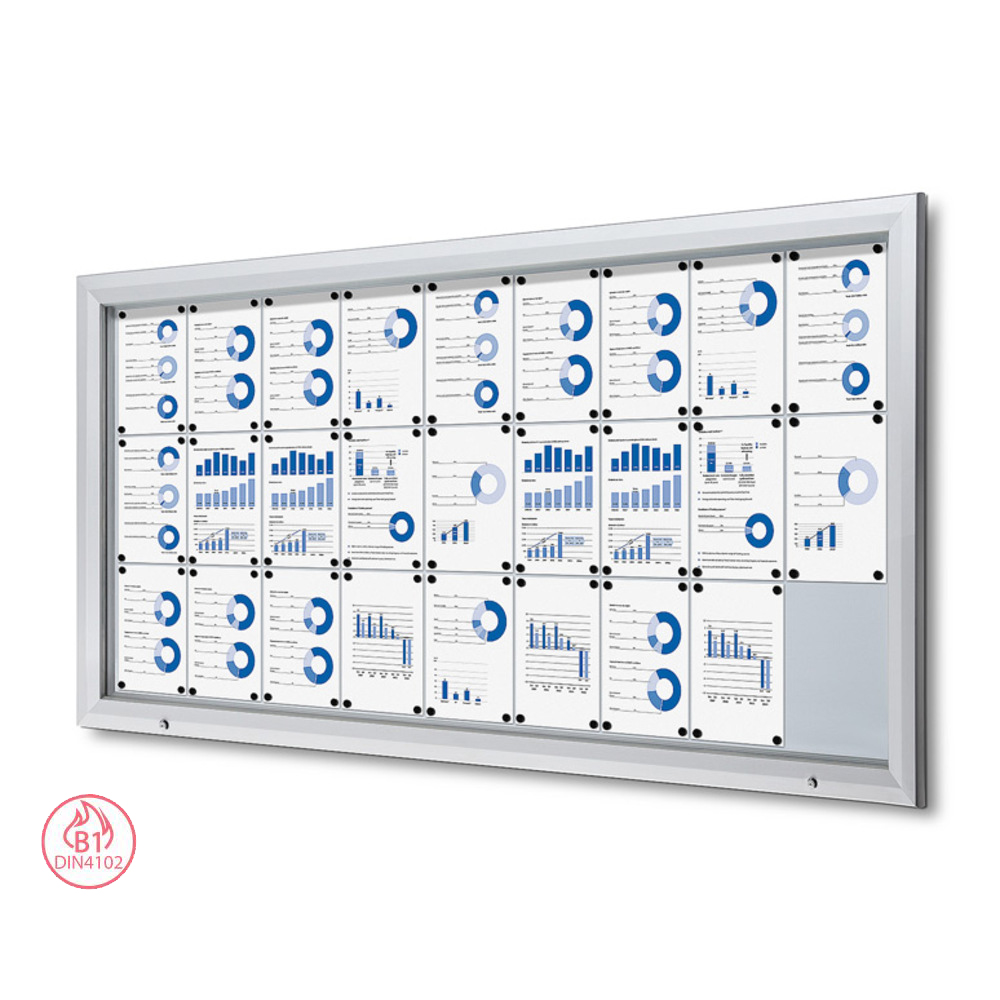 Präsentieren Sie Ihre Nachrichten oder Notizen sicher mit unserem abschließbaren Schaukasten mit beschreibbarer Metallrückwand. Der Schaukasten lässt sich unten öffnen und mit einem Schlüssel sicher verschließen, was einen einfachen Zugang und zusätzliche Sicherheit gewährleistet. Ab einer Größe von 12 x A4 sind Gasdruckfedern enthalten, die die Fronttür halten und für den Komfort des Benutzers sorgen. Notizen oder Nachrichten können mit Hilfe von Magneten leicht in der Vitrine angebracht werden. Der Schaukasten ist B1-zertifiziert, was ihn zu einem sicheren und idealen Schaukasten für die Nutzung im Freien sowie im Innenbereich macht.