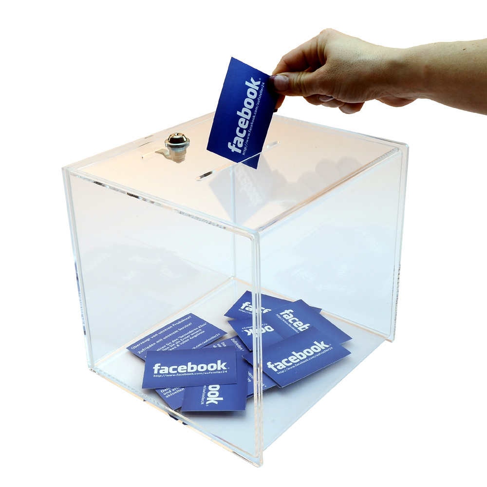 Sehr hochwertige Einwurfbox / Losbox für Postkarten, Visitenkarten und Flyer. Diese Losbox aus der Premium Serie überzeugt durch eine edle Verarbeitung aus hochwertigem Acrylglas (Korpus 3mm, Seitenteile 5mm). Die eingelassene Rückwand wird mit einem Handgriff herausgezogen. Der Einwurfschlitz ist mit einer Breite von 11,0cm (0,6cm tief) passend für Postkarten und Flyer. Ein echter Blickfang bei der Premium Serie sind die betonten, überstehenden Kanten. Durch das eingearbeitete Schloss kann diese Einwurfbox verriegelt werden. Der Schließmechanismus greift in die eingelassene Rückwand. Ein Hingucker auf Messen und Ausstellungen. Lieferung erfolgt inkl. 2 Schlüsseln.