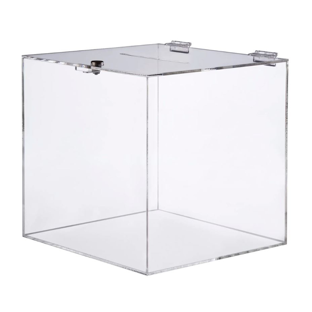 Einwurfbox / Losbox für Postkarten und Flyer. Edle Verarbeitung aus klarem Acrylglas. An dem Deckel befinden sich zwei Scharniere zum Aufklappen des Deckels. Durch das eingearbeitete Schloss kann diese Einwurfbox verriegelt werden. Der Einwurfschlitz mit einer Breite von 21,5cm (0,5cm tief) ist passend für Postkarten, Visitenkarten und Lose. Eine tolle Idee für Messen und Ausstellungen, ideal für die Entgegennahme von Adresskarten. Lieferung erfolgt inkl. 2 Schlüsseln.