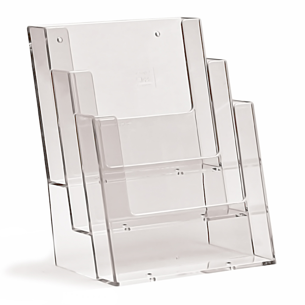Multi-Prospektständer der Marke Taymar mit 3 Etagen DIN A5. Formschöner Prospektständer mit 3 Fächern für DIN A5, hochwertige Verarbeitung aus klarem Polystyrol, für eine exzellente Präsentation Ihrer Flyer und Prospekte. Diesen Prospekthalter bieten wir in verschiedenen Größen an.